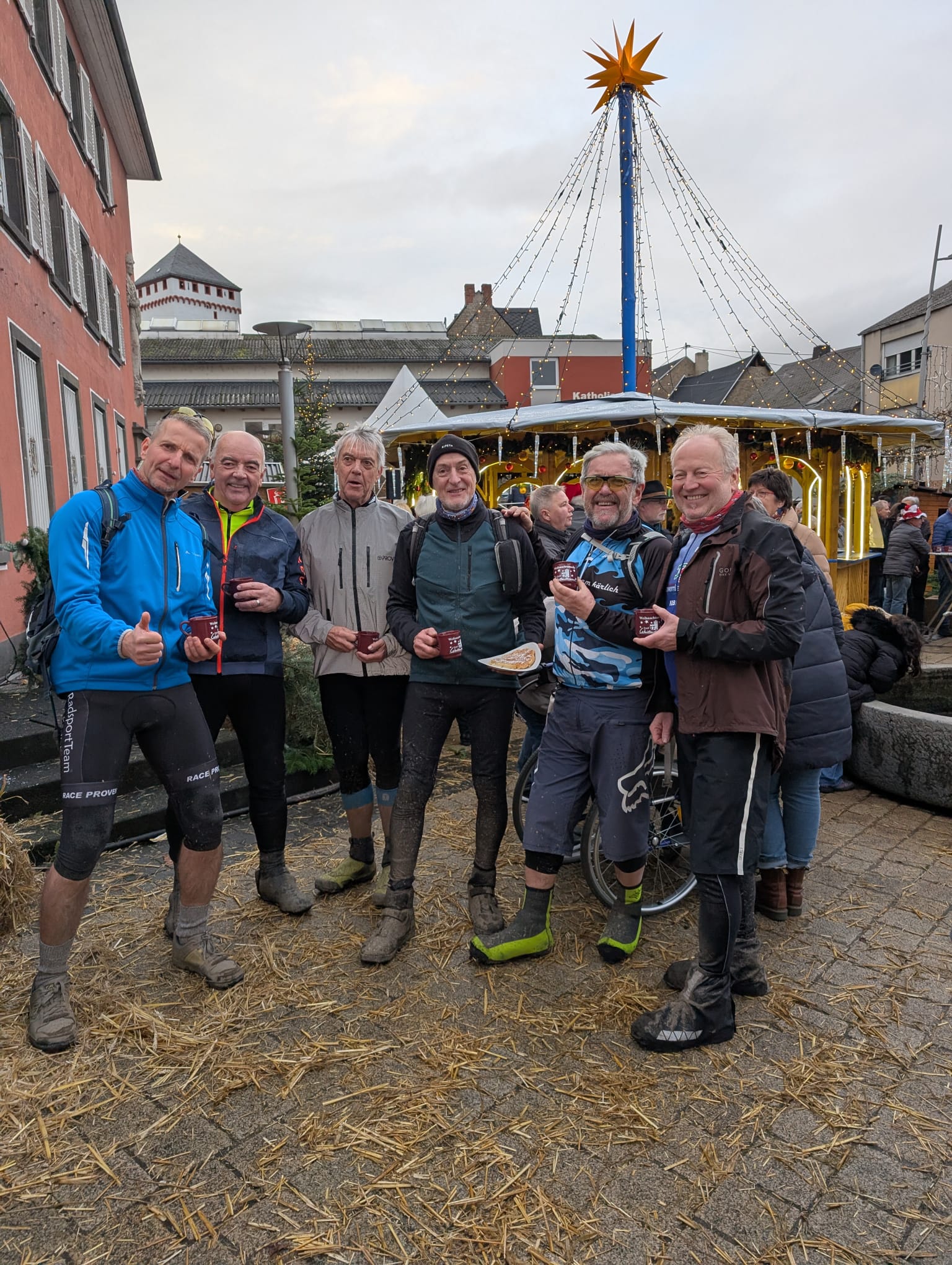 | Auch in diesem Jahr starten die Mountainbiker der Radsport-Abteilung des TV Kärlich wieder ihre Weihnachtsmarkt-Pokal-Serie. Hierbei werden in der besinnlichen Zeit die Weihnachtsmärkte an Samstagen oder Sonntagen in der näheren Umgebung angefahren. Jeweils nach einer 2- bis 3-stündigen Mountainbike-Tour findet dann der Abschluss auf einem der Weihnachtsmärkte statt. Ziele bisher waren Nickenich und Weißenthurm, weitere Orte folgen an den nächsten Wochenenden vsl. Kärlich, Andernach oder in Neuwied. Den Abschluss einer oft matschigen Tour mit einem leckeren Glühwein und einer Bratwurst zu begehen macht Lust auf den nächsten Besuch. Der Teilnehmer mit dem Besuch der meisten Märkte erhält zum Abschluss den begehrten Weihnachtsmarkt-Pokal. |